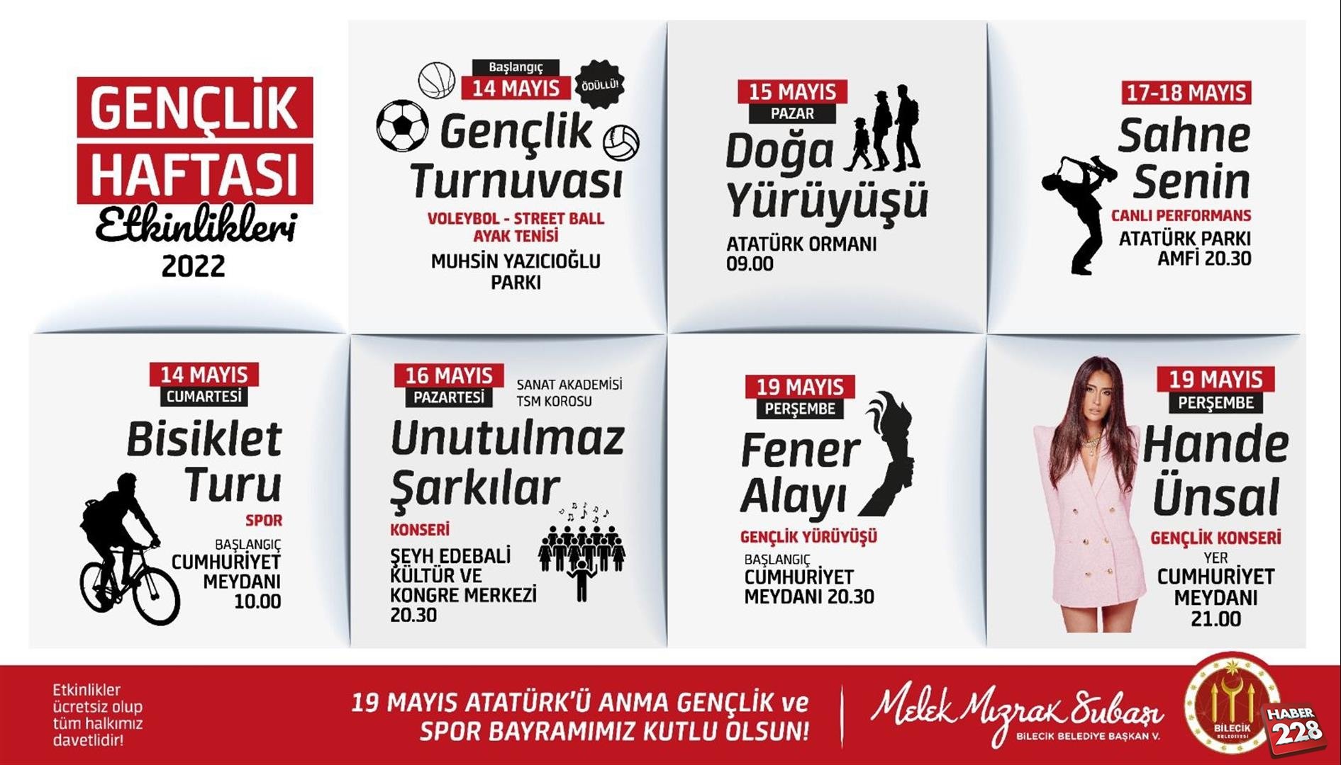 Bilecik Belediyesi tarafından hazırlanan etkinliklerle 19 Mayıs Atatürk’ü Anma, Gençlik ve Spor Bayramı haftası, birbirinden güzel aktivite ile değerlendirilecek.