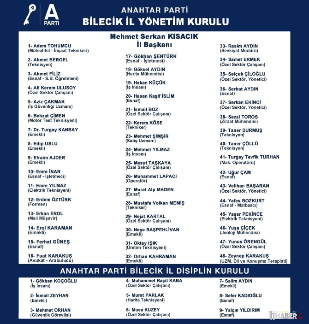 Anahtar Parti Bilecik İl Başkanlığı yönetim kurulu listesi ile Disiplin kurulu belli oldu.