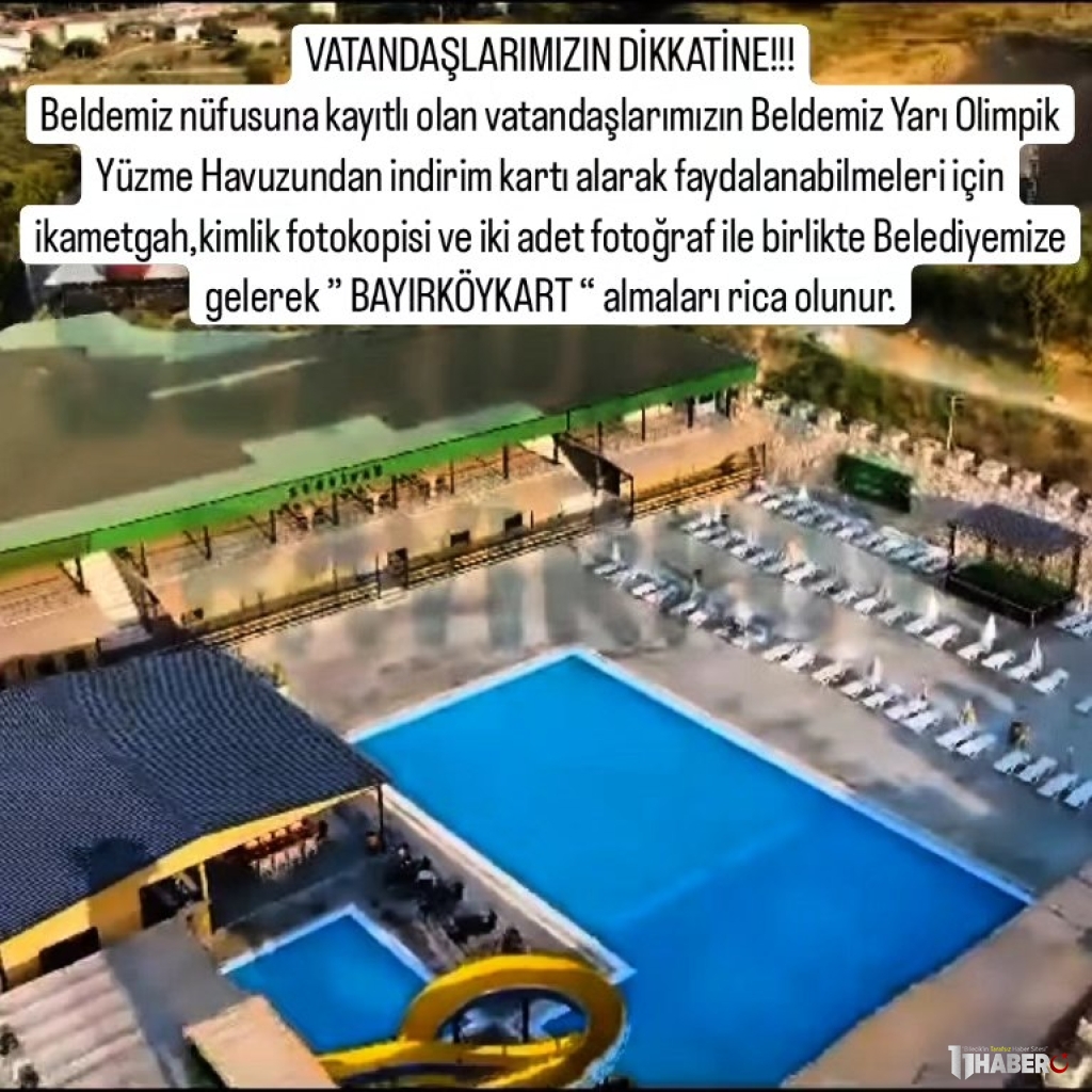 “Beldemiz nüfusuna kayıtlı olan vatandaşlarımızın Beldemiz Yarı Olimpik Yüzme Havuzundan indirim kartı alarak faydalanabilmeleri için ikametgah,kimlik fotokopisi ve bir adet fotoğraf ile birlikte Belediyemize gelerek ” BAYIRKÖYKART “ almaları rica olunur.”