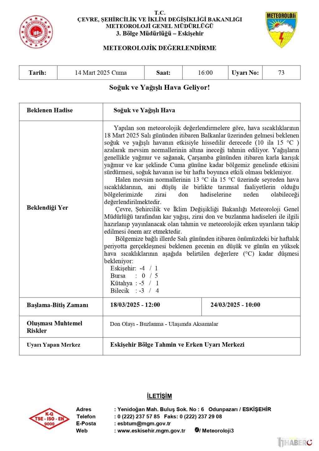 “Yapılan son meteorolojik değerlendirmelere göre, hava sıcaklıklarının 18 Mart 2025 Salı gününden itibaren Balkanlar üzerinden gelmesi beklenen soğuk ve yağışlı havanın etkisiyle hissedilir derecede (10 ila 15 °C ) azalarak mevsim normallerinin altına ineceği tahmin ediliyor. Yağışların genellikle yağmur ve sağanak, Çarşamba gününden itibaren karla karışık yağmur ve kar şeklinde Cuma gününe kadar bölgemiz genelinde etkisini sürdürmesi, soğuk havanın ise bir hafta boyunca etkili olması bekleniyor. Halen mevsim normallerinin 13 °C ila 15 °C üzerinde seyreden hava sıcaklıklarının, ani düşüş ile birlikte tarımsal faaliyetlerin olduğu bölgelerimizde zirai don hadiselerine neden olabileceği değerlendirilmektedir.