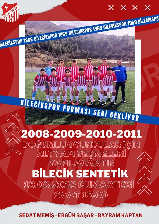 BİLECİKSPOR, ALTYAPI SEÇMELERİNE ÇIKIYOR 15 Mart 2023, 23:32 yayınlandı + - Paylaş Bu Yazıyı Paylaş veya linki kopyala Kopyala 1969 Bilecikspor Kulübü; altyapı oyuncuları için seçmelere çıkıyor. 2008,2009, 2010 ve 2011 doğumlu oyuncular arasından yapılacak altyapı takımı oyuncu seçmeleri Bilecik Sentetik sahada saat 10.00’da gerçekleştirilecek. BİLECİKSPOR, ALTYAPI SEÇMELERİNE ÇIKIYOR