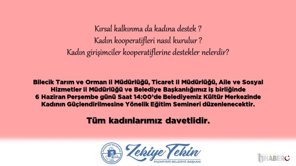 Pazaryeri Belediye Başkanı Zekiye Tekin ilçe’de yaşayan kadınlara seslenerek;” bu fırsatı kaçırmayın” dedi.